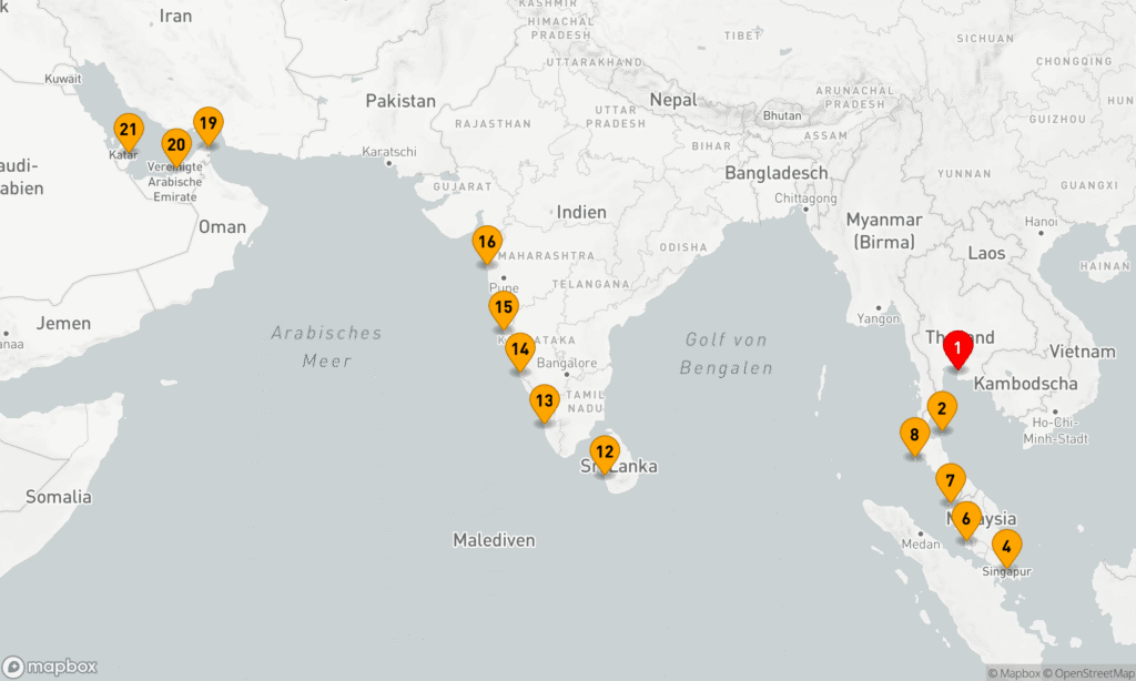 Mit Thailand, Singapur, Malaysia, Thailand, Sri Lanka, Indien, den VEA und dem Oman